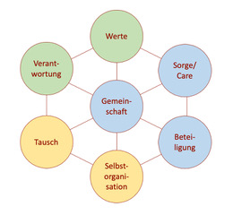 - Werte: Die Ausrichtung auf das Gemeinwohl prägt die Grundhaltung, das Wohlergehen aller ist im Blick. In der Community sind die Werte klar erkennbar, aus ihnen leiten sich die Ziele für das gemeinsame Arbeiten ab.